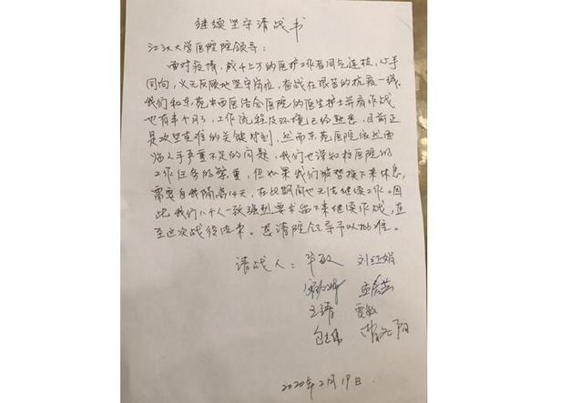 2月19日本是江汉大学校医院8位医护人员连续工作15天后休息的日子,可她们又主动要求取消休息,向医院写出继续坚守请战书,留下来继续战斗。
