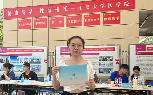 8月27日上午11时,身着白色上衣,带着录取通知书,姜萌迈着轻快的步伐来到江汉大学医学院新生报到处,在老师的指导下,完成了新生入学手续。