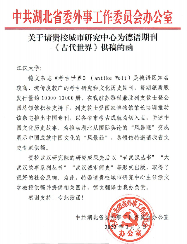 近日,我校收到中共湖北省委外事工作委员会办公室关于请我校城市研究中心为德语期刊《考古世界》供稿的函,热诚邀请城市研究中心主任涂文学教授为该刊撰文,翻译成德文后面向世界传播。