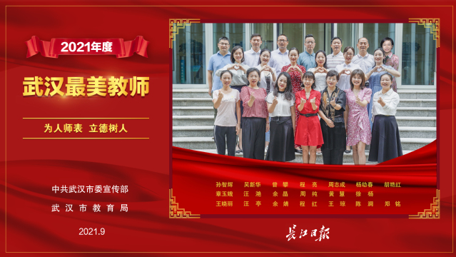 2021年度武汉“最美教师”评选活动,是武汉市首次举办此项教师评选。本次评选由中共武汉市委宣传部、武汉市教育局主办,长江日报报业集团承办,旨在发掘宣传基层优秀教师典型,彰显新时代人民教师的理想情操、高尚师德和人格魅力,激励广大教师不忘立德树人初心,牢记为党育人、为国育才使命,在全社会营造尊师重教的良好风尚。