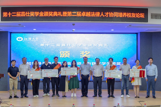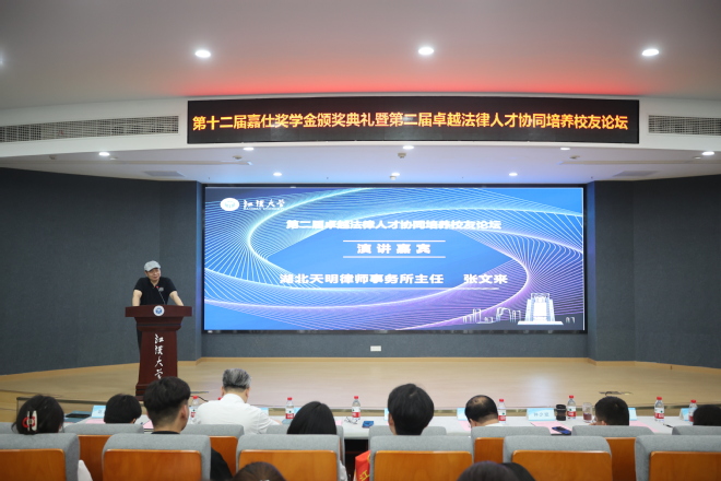 6月26日下午,法学院第十二届“嘉仕奖学金”颁奖典礼暨第二届卓越法律人才协同培养校友论坛在图书馆学术报告厅举行。副校长夏松出席颁奖典礼,并与校友座谈交流。“嘉仕奖学金”捐资人,十一届、十二届全国人大代表、全国优秀律师、湖北得伟君尚律师事务所合伙人会议主席、管委会主任蔡学恩,湖北天明律师事务所主任张文来,武汉精益眼镜有限公司董事长钟少斌,湖北万泽律师事务所执行主任周静雯,湖北敏讷律师事务所合伙人卢训尧,湖北游于艺律师事务所主任李航等校友捐资人专程返回母校参加颁奖典礼。校社会合作与校友工作处、法学院相关负责人、师生代表以及往届获奖学生代表参加了活动。颁奖典礼由法学院院长赵立新主持。
