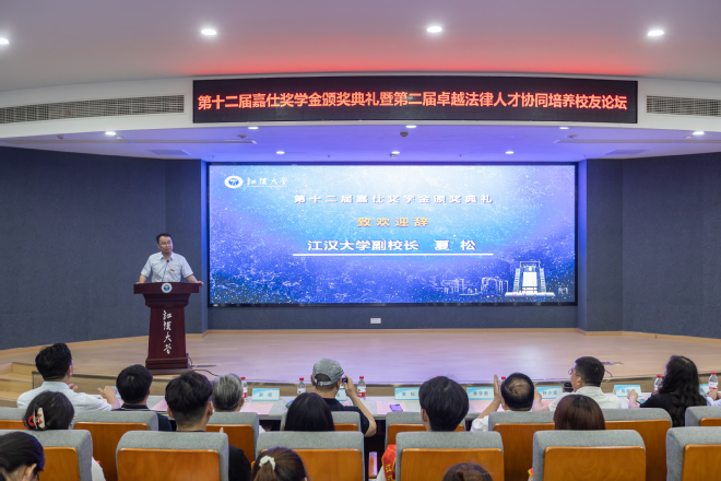 典礼仪式上,夏松致欢迎词。他指出,十二载春华秋实,十二载育人不辍。法学院嘉仕奖学金为促进学院在营造优良学风,建设一流本科课程,培养卓越法律人才等方面形成了良好的引领示范效应。通过嘉仕奖学金的评选,学院培养出了一批又一批优秀的法律人才,在各自工作岗位上展现了新作为、作出了新贡献。当前,学校正处于新十年发展的新征程上,希望校友们能够一如既往地关心母校,支持母校,为母校的改革发展献计献策、贡献力量。
