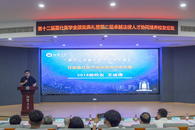 2018级校友、湖北得伟君尚律师事务所青年律师王成博作为往届“嘉仕奖学金”获得者代表发言。他表示,嘉仕奖学金不仅是一种鼓励,更是一种鞭策,不断激励其在法学道路上奋勇向前。同时,他结合自身经历给同学们提出相关建议。