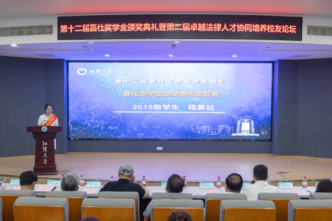 2019级法学专业程昊喆作为本届“嘉仕奖学金”获得者代表发言,她深情回顾了在校期间的学习和奋斗经历,分享了求学中的艰辛与坚持。她感恩学校培养和校友支持,表示将怀揣感恩之心努力成为一名有情怀、懂奉献、知感恩的“嘉仕人”,接过优秀校友接力棒,传承江大法律人追求公平正义、捍卫法治尊严的专业信念和理想情怀。
