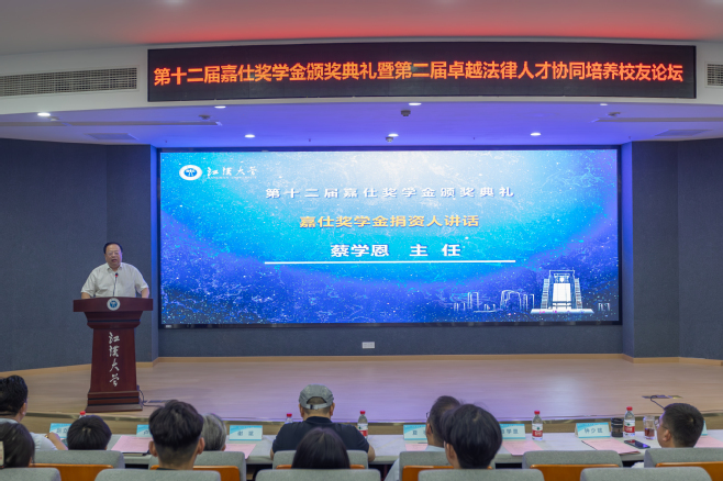 捐资人蔡学恩在讲话中,以校友学长身份分享了江大法律人参与国家法律事业的宝贵经历,从中国式现代化的宏大视角和互联网社会生动鲜活的法治故事,深刻诠释了江大法律人面向法治中国建设应有的人格塑造和使命担当。同时,勉励同学们要坚守法治初心,秉持奉法强国情怀,积极投身全面依法治国的宏伟事业中,争做合格法律人。