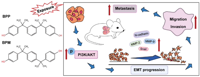 江汉大学医学部肿瘤研究团队致力于常见恶性肿瘤的发生发展机制与干预策略的研究。该团队首次在细胞和动物水平证实了新型双酚类化合物双酚P(Bisphenol P, BPP)和双酚 M(Bisphenol M, BPM)通过激活PI3K/AKT信号通路诱导上皮细胞间质化进程,从而促进三阴性乳腺癌的转移。该研究成果拓宽了对双酚类化合物生物效应的了解,提示在研究双酚类化合物时,应当涵盖独立于内分泌系统和激素受体的作用,同时也为进一步理解三阴性乳腺癌的转移机制提供了科学依据。
