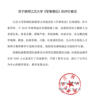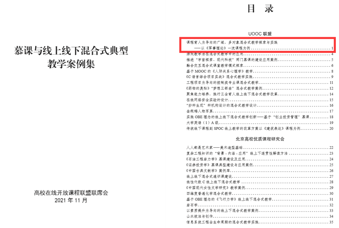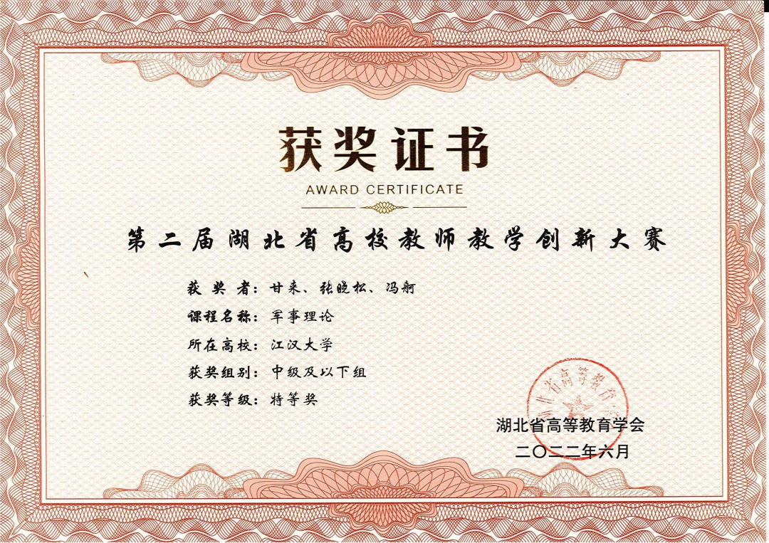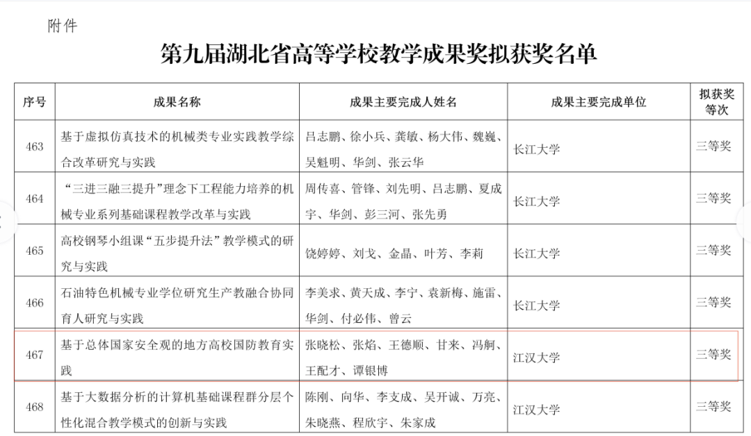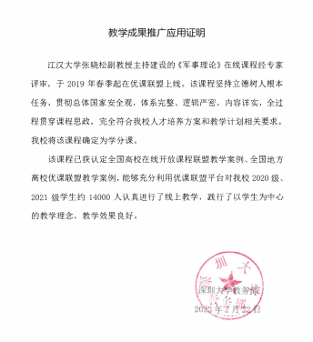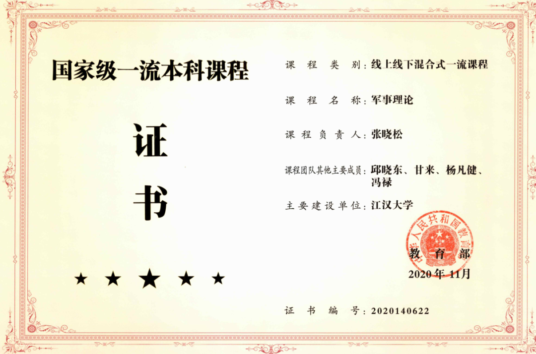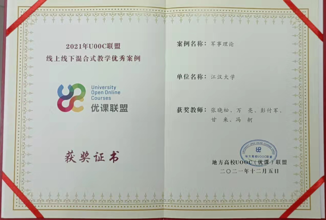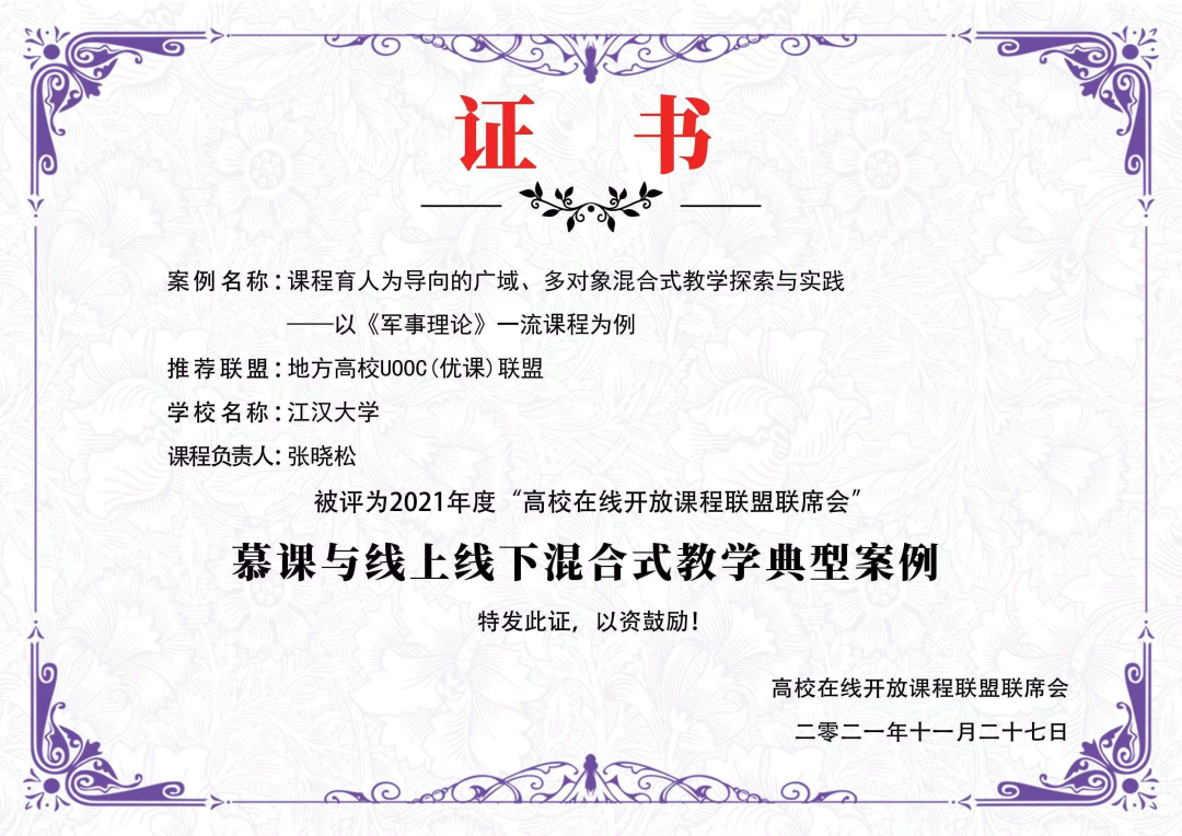 经过多年的深耕不辍,他建设的课程认定为首批国家级一流本科课程、省级一流本科课程。“我校军事理论课目前是全国唯一的混合式国家一流本科课程、是全省唯一的一流课程。”他的教学实践,在全国慕课教育大会上评为“典型教学案例”。案例编印在大会《案例集》首篇。在有着134所加盟高校的全国地方高校优课联盟里,也评为排序第一的“优秀教学案例”。他主持完成的课题成果,评为湖北省教育教学成果三等奖。