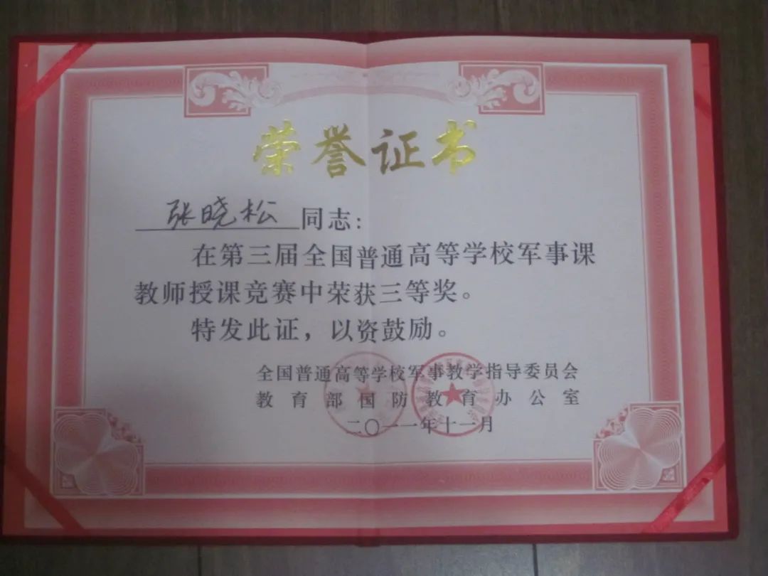 2011年教育部国防教育办公室主办全国军事课教学竞赛,张晓松以省赛前三名的成绩进入国赛,彼时的张晓松刚工作两年,无论专业背景还是教学经验都不占优势,“那时确实压力很大,感受到差距,就自己下功夫学习吧!以备赛为契机,提高教学水平。”最终,他在复旦大学,获得国赛三等奖,这是我校自己培养的军事课教师在教育部官方全国教学竞赛中首次获奖。