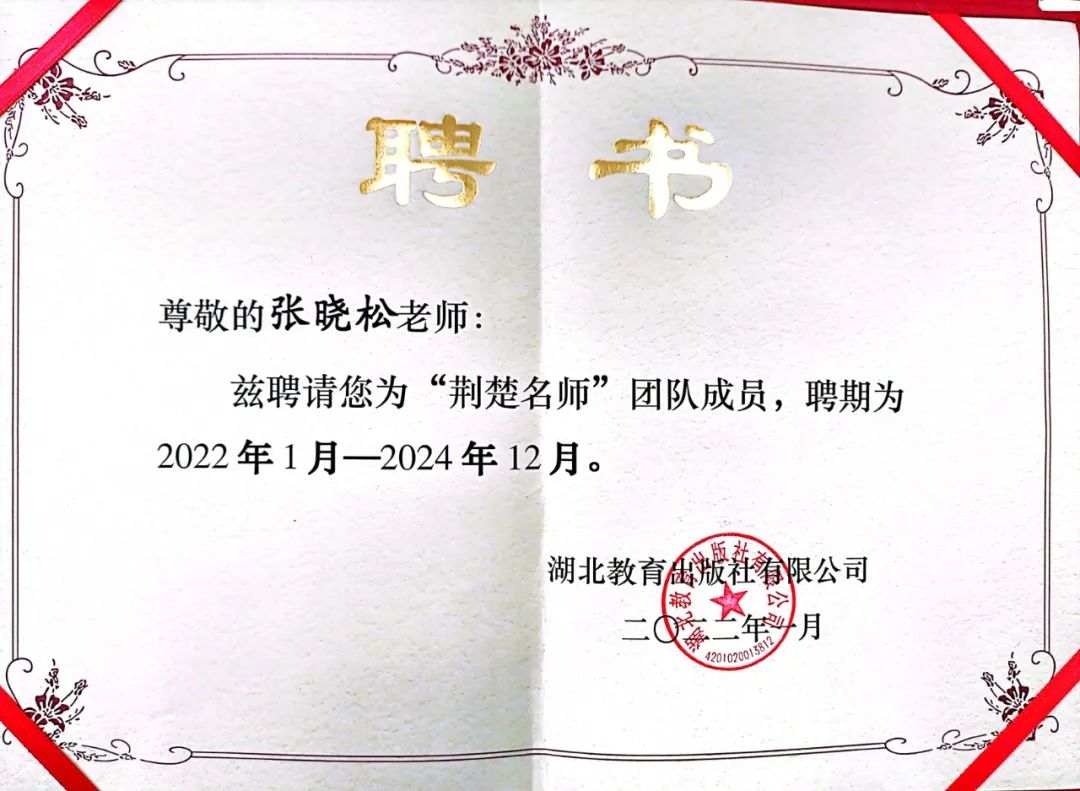 鉴于张晓松在国防教育教学领域用心用力钻研教学的态度、实干和业绩,湖北教育出版社请他接连主编了鄂教版的中小学学段的不同学期的《国防教育读本》共十余部,并和一批中小学教师骨干一道被聘为湖北教育出版社的“荆楚名师”。