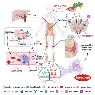 退行性骨疾病是中老年人最常见的健康问题之一,全面了解骨关节系统中铁的代谢特点,深入研究不同病理背景下铁死亡相关调控通路,对疾病的临床治疗具有重大的研究价值和转化意义。该文章系统总结了铁的代谢和铁死亡的调控机制及其在退行性骨疾病中的最新进展,全面总结了骨系统中铁死亡与凋亡、自噬等死亡方式的交互作用,为探索新型退行性骨疾病防治策略打下坚实的理论基础,并展望了该领域未来的发展方向。