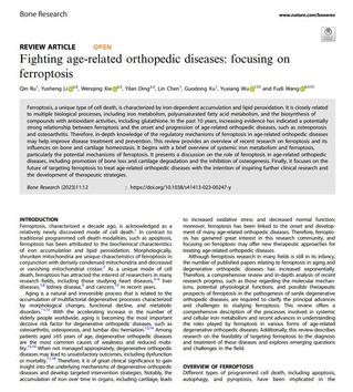 近日,体育学院吴钰祥教授团队在国际顶级期刊《Bone Research》(中科院SCI一区TOP,影响因子13.36)发表了题为《Fighting age-related VVVVVV orthopedic diseases: focusing on ferroptosis》的重要研究成果,并被选为期刊封面文章。茹琴副教授为论文的第一作者,吴钰祥教授为第一通讯作者,江汉大学为第一作者单位和第一通讯单位。