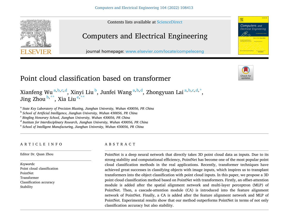 近日,我校炳灵学院人工智能专业2020级本科生吴显峰以第一作者身份在《Computers and Electrical Engineering》杂志上发表了题为《Point Cloud Classification Based on Transformer》的学术论文。该论文由江汉大学人工智能学院赖重远副研究员、周静教授和智能制造学院刘霞教授联合指导完成,江汉大学为唯一署名单位。