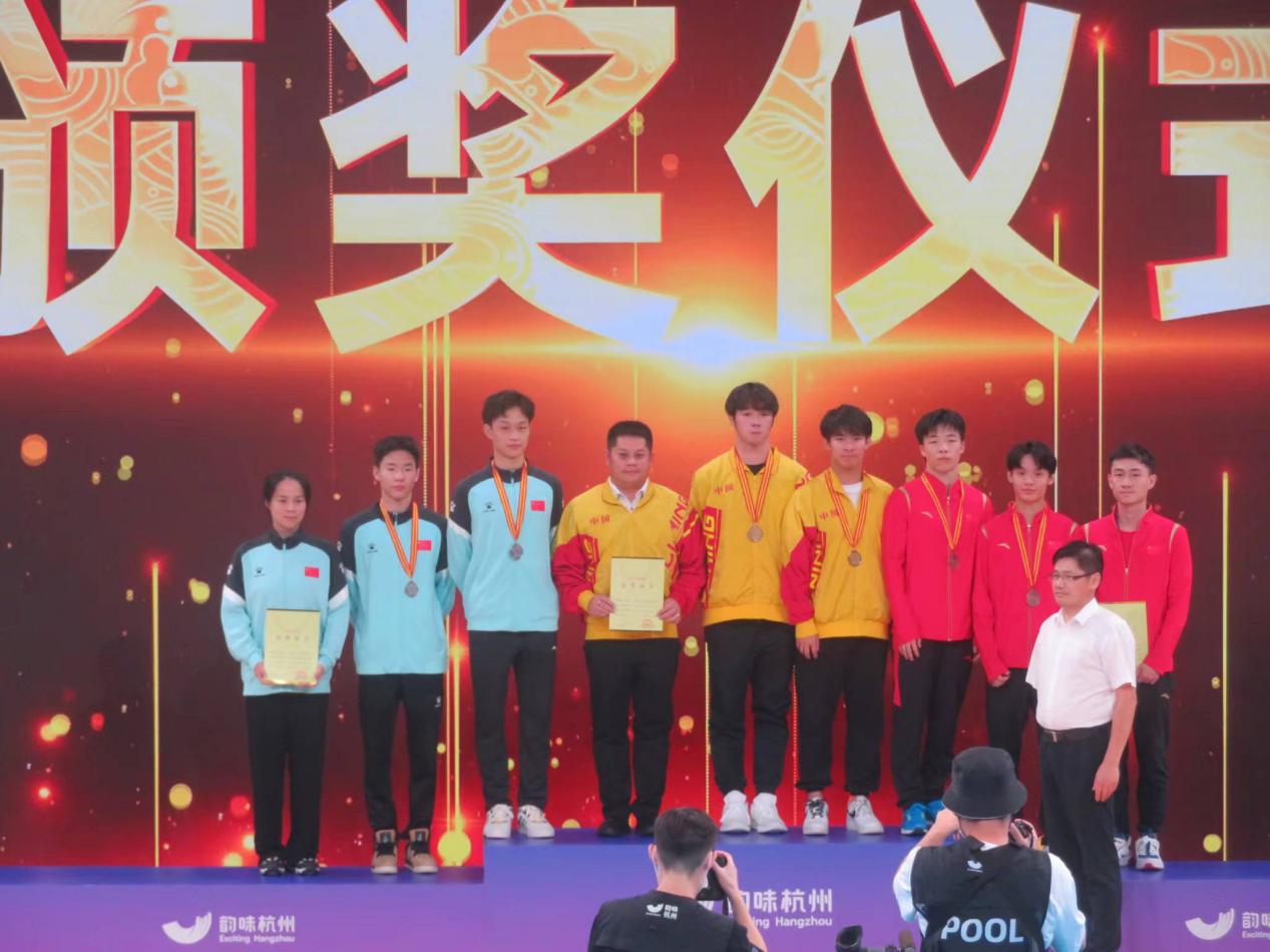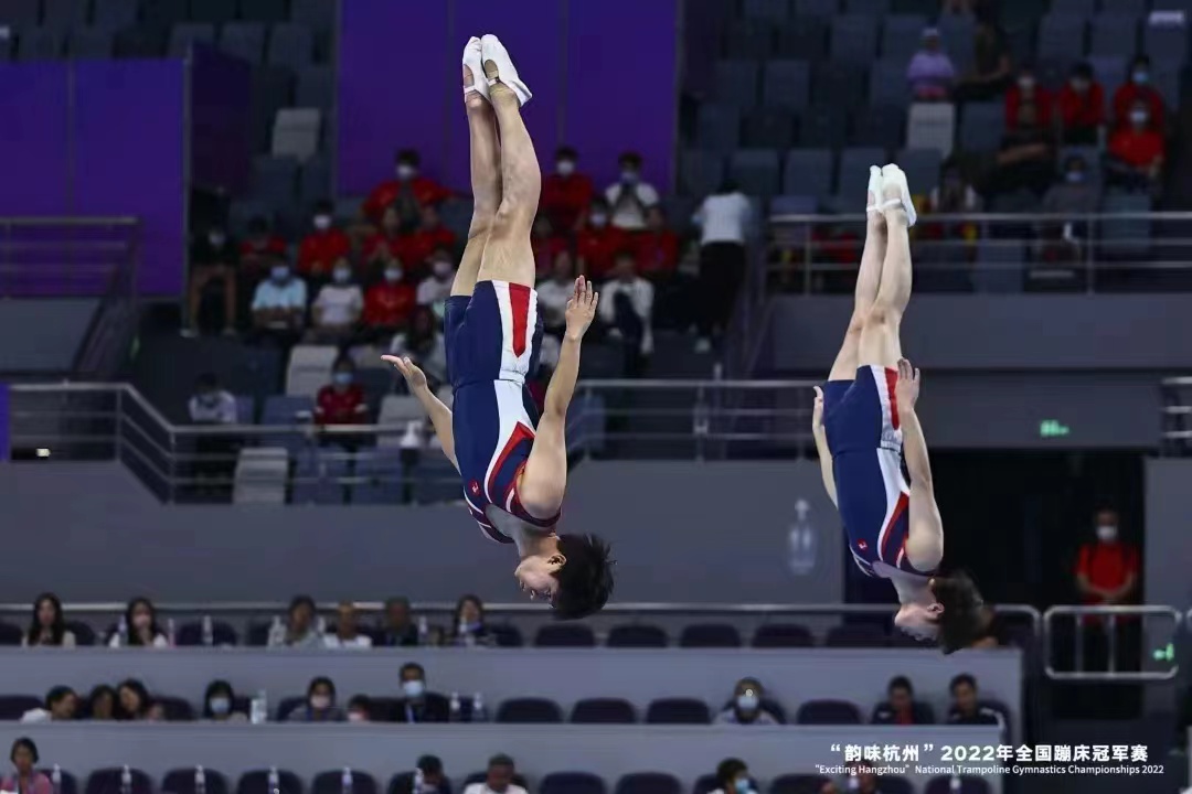 9月18日,2022年全国蹦床冠军赛在浙江省黄龙体育中心落下帷幕。我校体育学院2022级运动训练专业学生韦鑫辉、陈星宇夺得男子双人同步项目金牌。